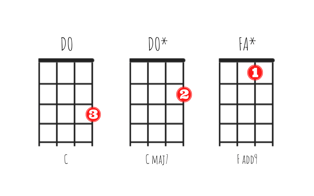 Per començar a aprendre a tocar acords amb l’ukelele triarem alguns en els quals només necessitem posar un dit amb la mà esquerra, en aquest cas, aprendrem el de Do Major (C), Do Major sèptima (CMaj7) i el de Fa amb novena (Fadd9) .